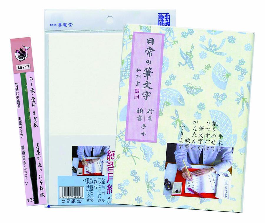 筆ペン、写し書き練習用紙。テキストが入ってすぐに始められる。