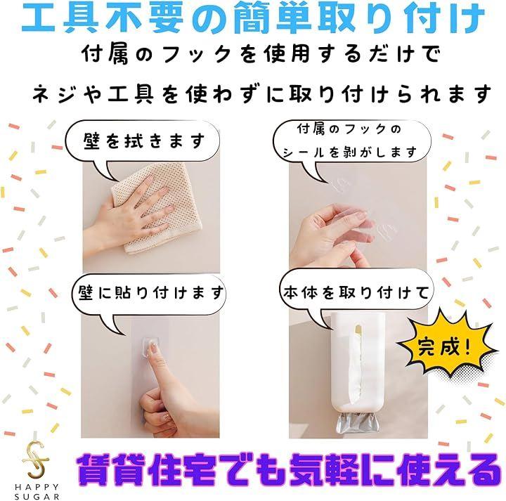 「簡単に取り付けでき、工具不要」壁掛けティッシュケースを取り付ける際、ネジや工具を使わずに簡単に設置できる点が特徴です。