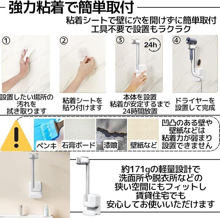 「日常で大活躍」・朝のスタイリングを効率よく行いたい方 ・お子様や高齢者の髪を乾かす場面 ・育児や介護など、両手を使いたい状況に ・スペースの限られた洗面所、寮、シェアハウス、賃貸住宅での活用に最適 ・ワンちゃんなどペットのドライヤーケアにも便利。