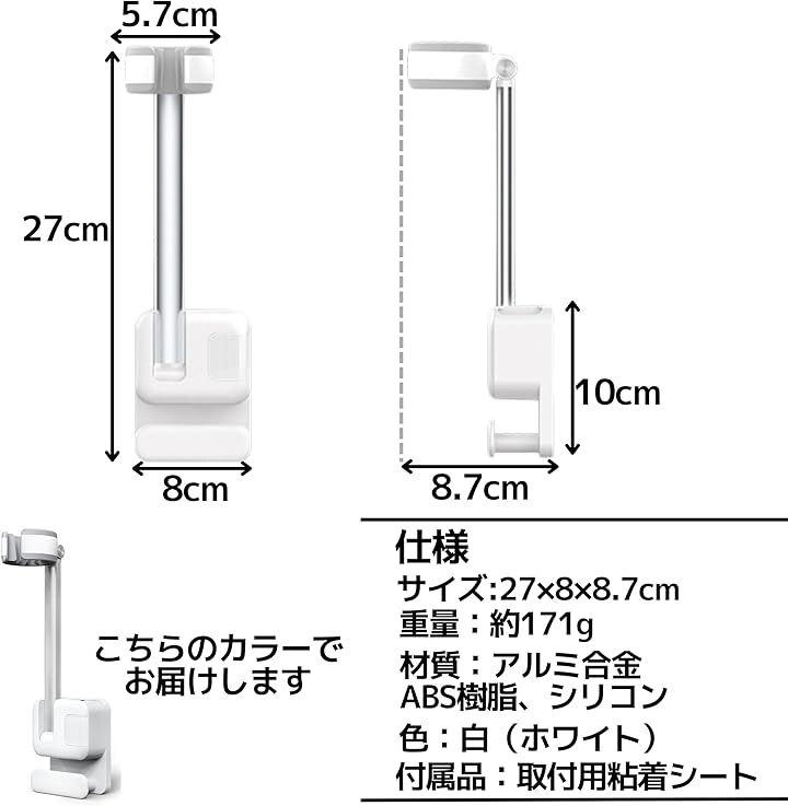 「商品仕様」サイズ:27x8x8.7cm 重量:約171g 材質:アルミ合金、ABS樹脂、シリコン 色:白(ホワイト) 付属品:取付用粘着シート