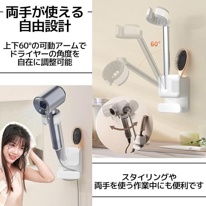 「両手が使える自由設計」上下60°の可動アームでドライヤーの角度を自在に調整可能。