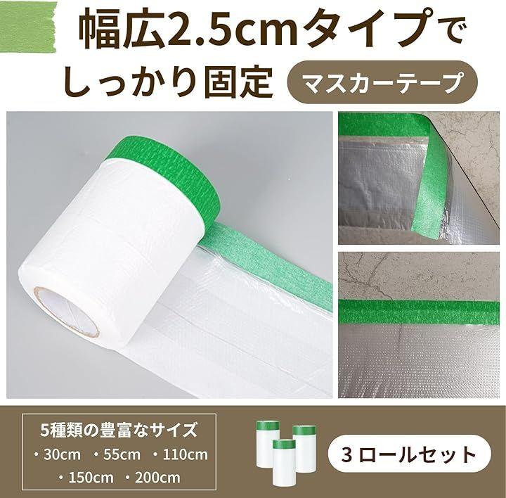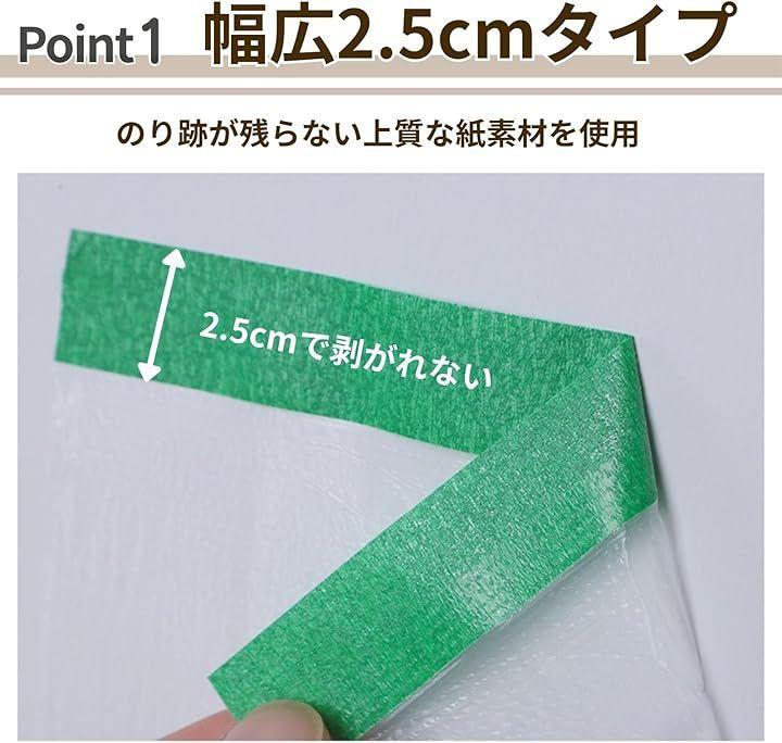 「幅広2.5cmテープでしっかり固定」通常より幅広の高粘着マスキングテープを採用し、剥がれにくくなっています。