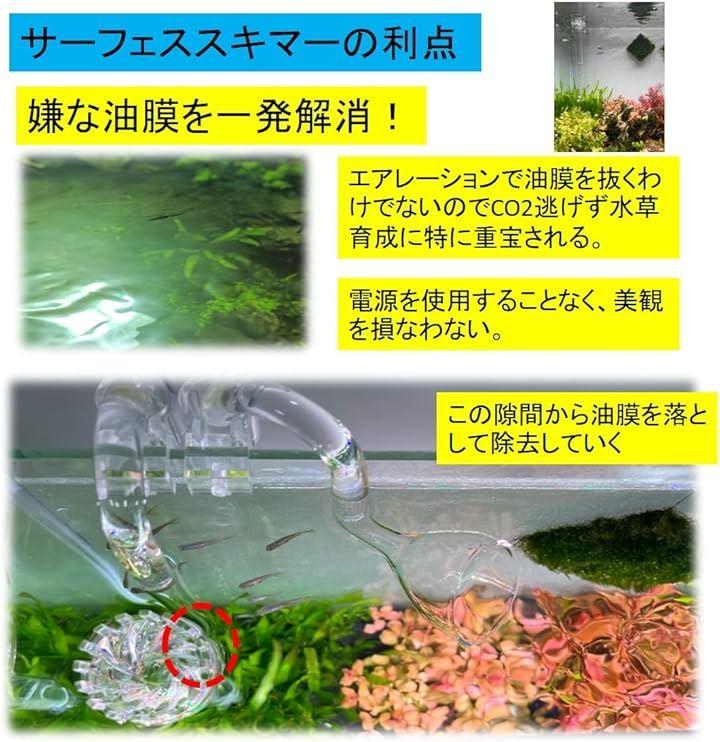 「サーフェススキマーの利点」:嫌な油膜を一発解消できる。エアレーションで油膜を抜くわけでないのでCO2逃げず水草育成に特に重宝される。