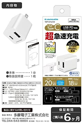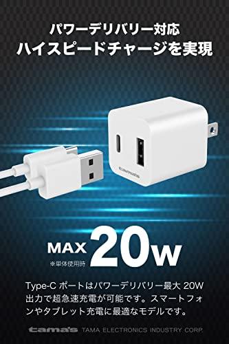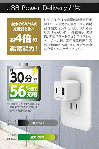 ●最大20W(単体使用時)のUSB PD対応USB Type-Cポートと最大18W(単体使用時)のUSB-Aポートを搭載したAC充電器。 ※2ポート同時使用時は合計最大5V 3Aになります。 ●過電流・過電圧保護機能を搭載した安全設計。 ●海外でも使用できるAC100V~240V対応。 ※国や地域によって市販の変換プラグが必要になる場合があります。