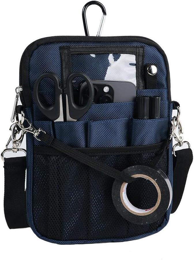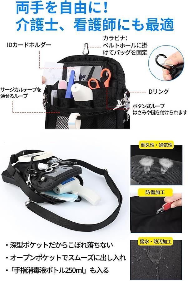 *「多数の便利機能」IDカードホルダー、サージカルテープを通せるループ、時計や鍵をつけられるDカンやボタン式ループ、ベルトループに掛けバッグの位置を固定できるカラビナが付いています。