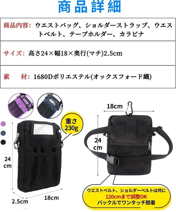 *「商品詳細」商品内容:ウエストバッグ、ショルダーストラップ、ウエストベルト、テープループ、カラビナ サイズ:高さ24x幅18x奥行(マチ)2.5cm 重量 本体:230g, ショルダーストラップ 50g, ウエストベルト 40g 素材:1680Dポリエステル(オックスフォード織) ウエストベルト、ショルダーベルトは共に120cmまで調整可能。
