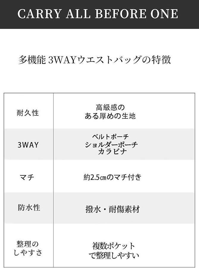 *「3WAY仕様」ウエストバッグ用と斜め掛け用の2種類のベルト、カラビナ付きなので、お好みのスタイルで使い分けできます。