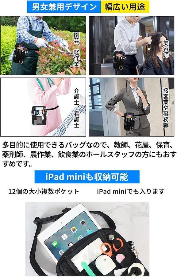 *「幅広い用途」軽作業やガーデニング、DIY用工具入れとしてだけでなく、接客業や事務職、倉庫業、店員、配達員、美容師、教師、介護士、看護師、保育士、家事・掃除、庭作業など様々なシーンで活躍。