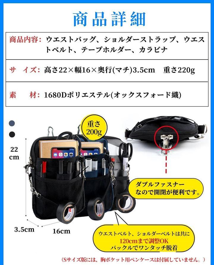 「商品仕様」 商品内容:ウエストバッグ、ショルダーストラップ、ウエストベルト、テープホルダー、カラビナ サイズ:高さ22x幅16x奥行(マチ)3.5cm 重量:220g 素材:1680Dポリエステル(オックスフォード織) (SサイズマチUP版には胸ポケット用ペンケースは付属していません。