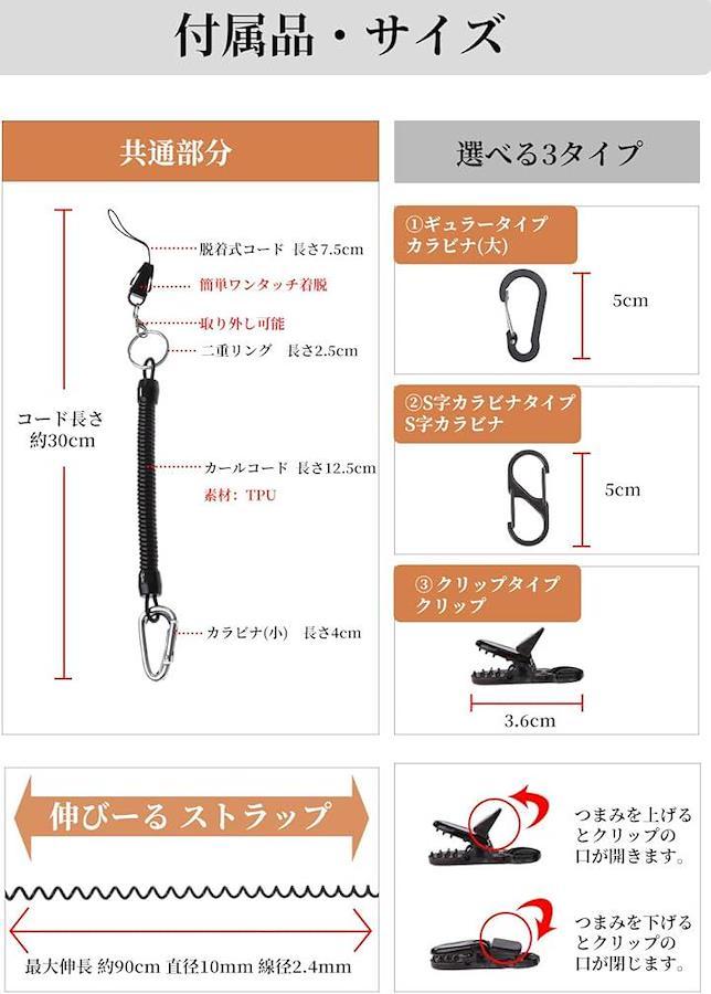 「商品詳細」商品内容 共通部分:コイルストラップ、二重リング、カラビナ(小)、脱着式コード 取り付け部分:レギュラータイプ:カラビナ(大) 、S字カラビナタイプ:S字カラビナ、クリップタイプ:クリップ 素材:カールコード/TPU、カラビナ(小) /アルミ合金、カラビナ(大)/アルミ合金、S字カラビナ/スチール、クリップ/プラスチック サイズ(コード全長):Mサイズ/約30cm Lサイズ/約32cm 重さ:レギュラータイプ、S字カラビナタイプ M 約20g L約25g、クリップタイプ M 約15g L約20g 最大耐荷重:1.5kg