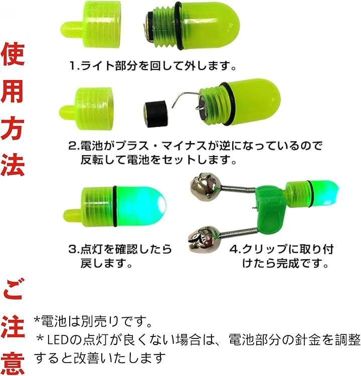 「 主な特徴」 ・竿先に簡単装着。 - クリップ式で取り付け簡単。 ・ 夜間でも視認性抜群。 - LEDライト搭載で暗闇でも確認可能。 ・音と光のダブル通知。 - 魚の当たりを見逃さない。 ・夜釣りの必需品。 - 暗い環境での釣りに最適。 10個セット。/ 20個セット