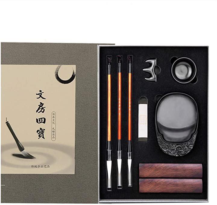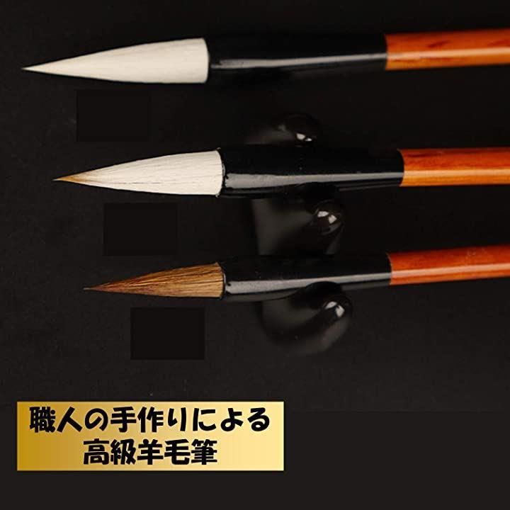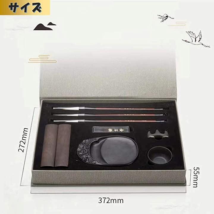セット内容:筆 3本(太,中,細)/ 硯 1個 / 墨 1本 / 文鎮 2本 / 筆置き 1個 / 水皿 1個