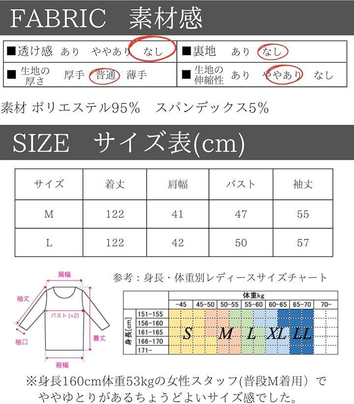 「素材」 95% ポリエステル, 5% 合成繊維(スパンデックス)「カラー」ブラック(黒)、ネイビー(紺)「サイズ(cm)」M 着丈122/肩幅41/バスト47/袖丈55 L 着丈122/肩幅42/バスト50/袖丈57