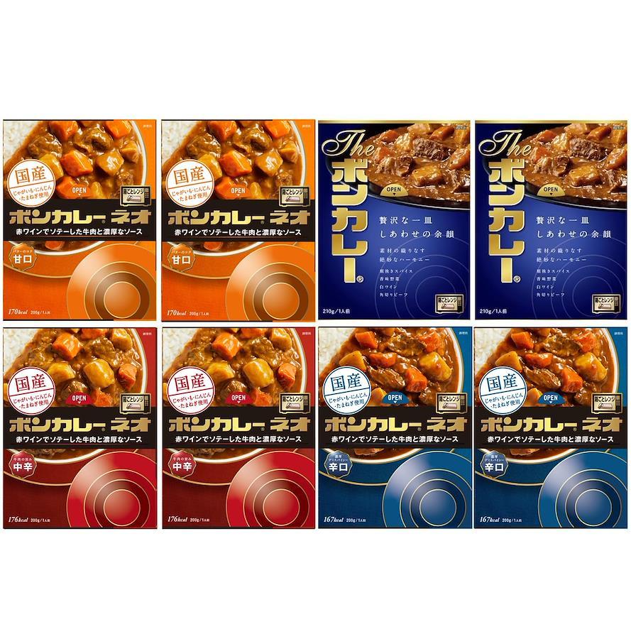いろいろ楽しむ「ボンカレー」のアソートセット「ボンカレーネオ」3種×各2食、「The ボンカレー」各2食、合計8食のボンカレー贅沢食べ比べセットです。【国産】たまねぎ・じゃがいも・にんじん使用【箱ごとレンジ】子どもからお年寄りまでレンジでかんたん調理!【重要】メーカーによる商品リニューアルに伴いパッケージ(内容量も含む)変更が行われた場合、新パッケージでお届け致します事ご了承願います。