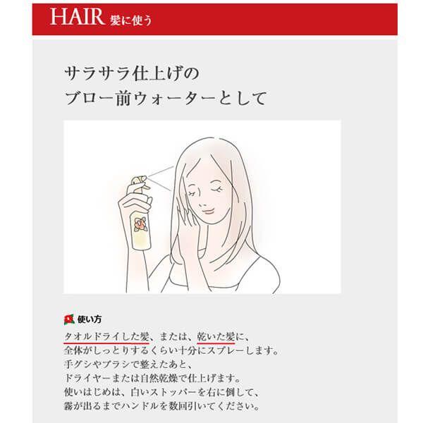 髪:ドライヤーの熱や紫外線(UVB)などによるダメージから髪を守る。うるおいとツヤを与えます。