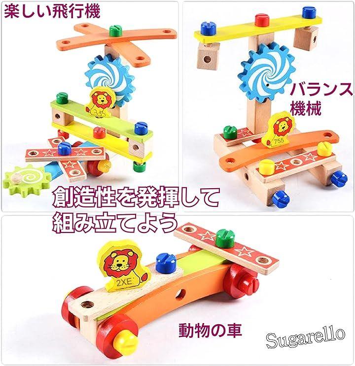 このセットには木製のハンマーやネジ、椅子、飛行機、車、ロボットなど、全部で49パーツが含まれています。