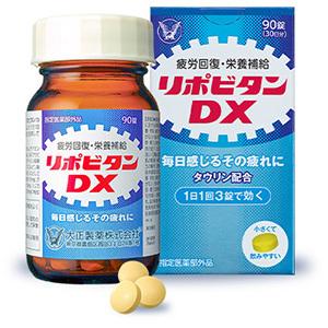 ■商品概要メーカー:大正製薬商品名:リポビタンDX(90錠)区分:医薬部外品内容量:90錠商品概要:【指定医薬部外品】毎日感じるその疲れに、1日1回3錠で効くJANコード:4987306030206商品コード:079512742■商品の特徴リポビタンDXは、糖質・脂質・タンパク質を生命活動に必要なエネルギーに変換するエナジーサイクルに働きかけ、疲労の回復や予防に役立ちます。加えて、体力・身体抵抗力又は集中力の維持・改善、栄養不良に伴う寝つきの悪さ・目覚めの悪さの改善などにも優れた効果を発揮します。 寝る前にも気にならないカフェインゼロ設計で、日々の元気をサポートします。■効能・効果☆疲労の回復・予防 ☆日常生活における栄養不良に伴う身体不調の改善・予防:疲れやすい・疲れが残る・体力がない・身体が重い・身体がだるい、肩・首・腰又は膝の不調、二日酔いに伴う食欲の低下・だるさ、寝付きが悪い・眠りが浅い・目覚めが悪い、肌の不調(肌荒れ、肌の乾燥) ☆体力、身体抵抗力又は集中力の維持・改善 ☆虚弱体質(加齢による身体虚弱を含む。)に伴う身体不調の改善・予防:疲れやすい・疲れが残る・体力がない・身体が重い・身体がだるい、肩・首・腰又は膝の不調、寝付きが悪い・眠りが浅い・目覚めが悪い、肌の不調(肌荒れ、肌の乾燥) ☆病中病後の体力低下時、発熱を伴う消耗性疾患時、食欲不振時、妊娠授乳期又は産前産後等の栄養補給■原材料/成分/素材/材質[3錠中] タウリン 500mg、チアミン硝化物(ビタミンB1) 10mg、リボフラビン(ビタミンB2) 5mg、ピリドキシン塩酸塩(ビタミンB6) 5mg、アスコルビン酸カルシウム 100mg(ビタミンCとして82.6mg)、カルニチン塩化物 10mg、グリシン 5mg、サンヤク末 10mg、シゴカ乾燥エキス 8mg(シゴカ200mgに相当)添加物:無水ケイ酸、セルロース、ヒドロキシプロピルセルロース、ステアリン酸Mg、タルク、マクロゴール、酸化チタン、ヒプロメロース、三二酸化鉄、カルナウバロウ■対象年齢/性別15歳以上■賞味期限/使用期限(製造から)3年■使用方法/召し上がり方水又はぬるま湯で服用してください。■使用上の注意1.定められた用法・用量を厳守してください。(他のビタミン等を含有する製品を同時に服用する場合には過剰摂取等に注意してください)2.服用に際しては、説明書をよく読んでください。3.直射日光の当たらない湿気の少ない涼しい所に密栓して保管してください。4.小児の手の届かない所に保管してください。5.使用期限を過ぎた製品は服用しないでください。■メーカー希望小売価格(税込)4268円■発売元/製造元/輸入元大正製薬■お問い合わせ先大正製薬お客様119番室03-3985-1800受付時間:8:30~17:00(土、日、祝日を除く)
