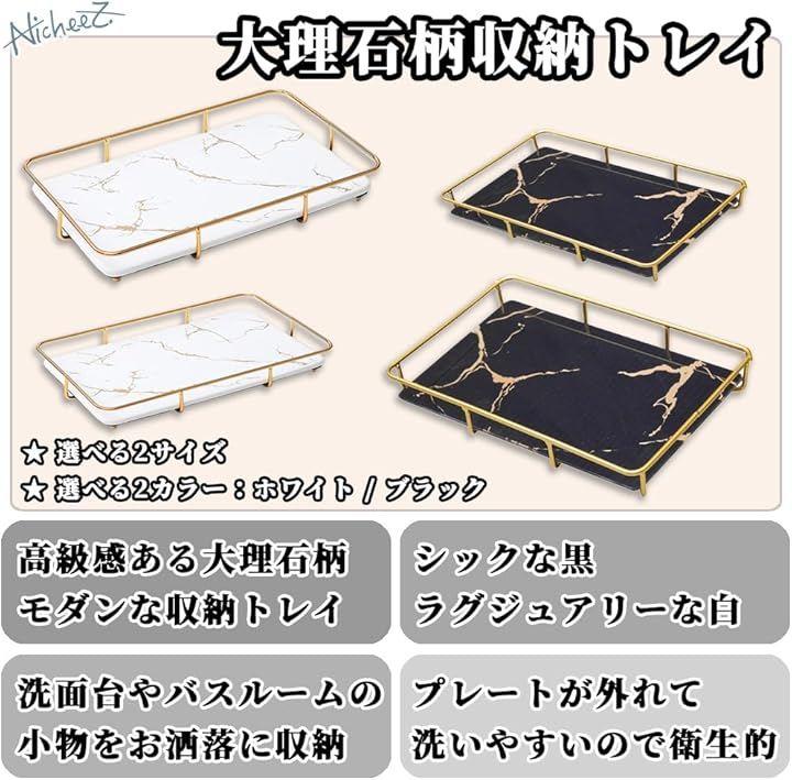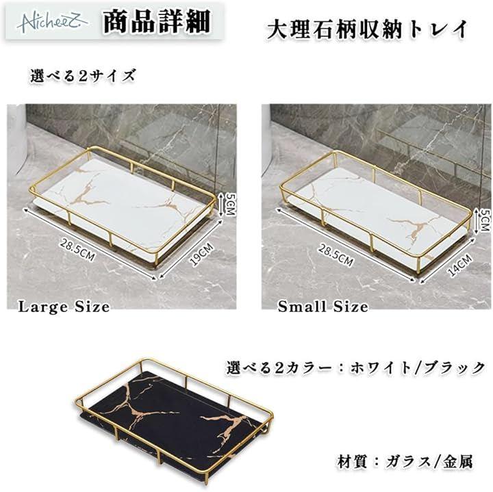 「商品内容」大理石柄収納トレイ 材質:ガラス/金属 カラー:ホワイト/ブラック 大サイズ:横/約28.5cm 縦/19cm 高さ/約5cm 小サイズ:横/約28.5cm 縦/14cm 高さ/約5cm