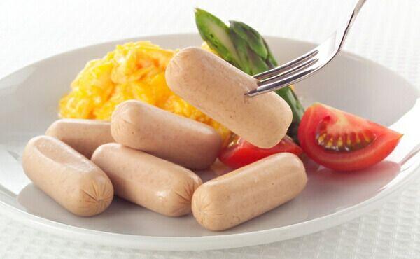 ●リンケッツは、大豆たんぱくを主原料に、卵白を加えウインナーソーセージ風に加工した食品です。