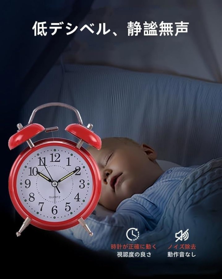 「目覚まし 連続秒針と静音機能」この目覚し時計は、良質な睡眠を保つことができ、どんな人でも快適に眠ることができます。