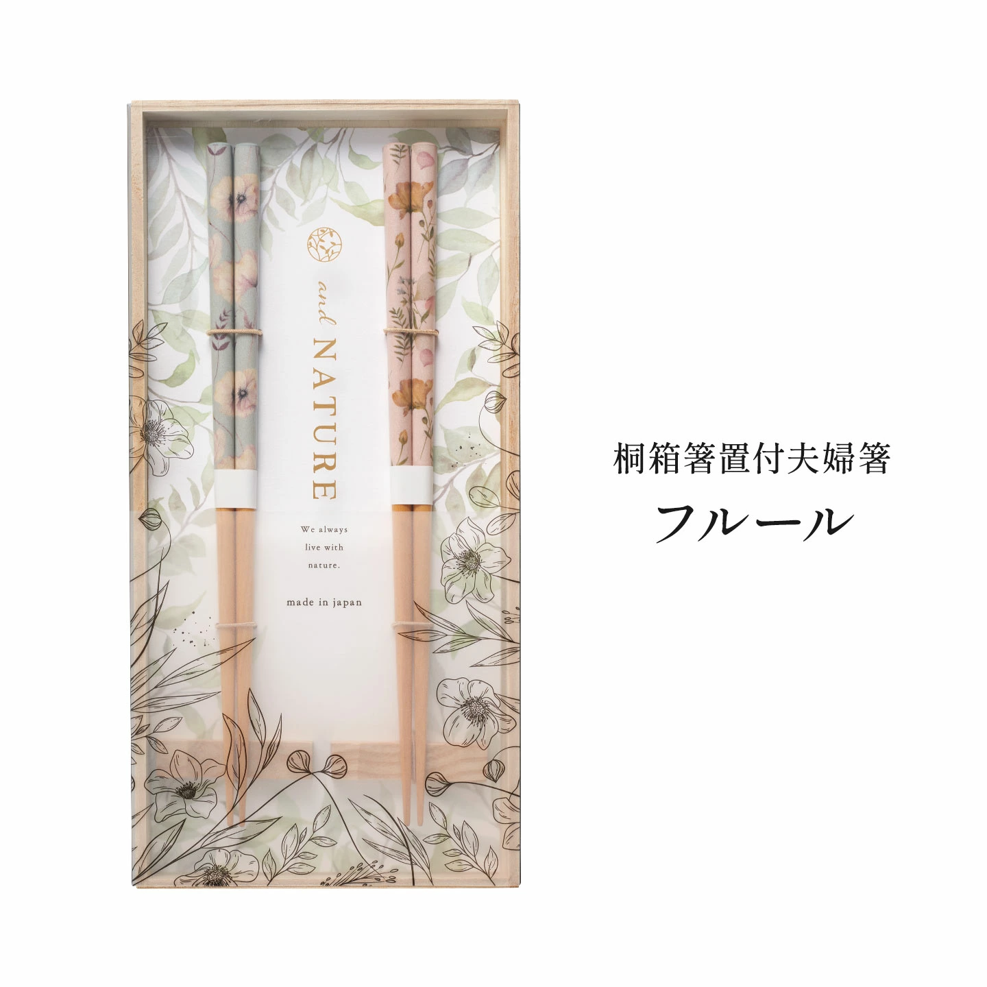 【桐箱箸置付夫婦箸】桐箱に収めた、日本製の箸&箸置きセット。天然木の箸とガラスの箸置きが上質感を添え、男女ともに使いやすい23.5cmの長さで仕立てています。夫婦箸としてはもちろん、結婚祝いなど大切なギフトにもおすすめです。
