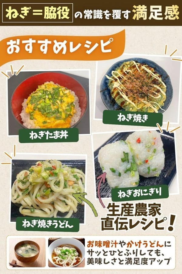「主役になる乾燥ネギ」ねぎ焼きやねぎたま丼など、ネギが主役になる料理にぴったり。