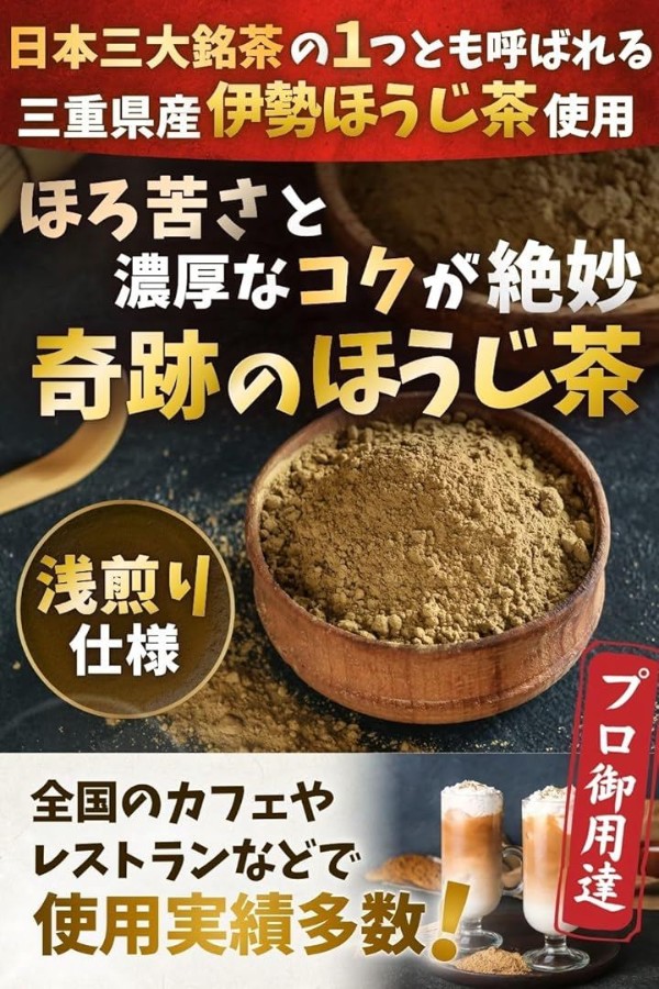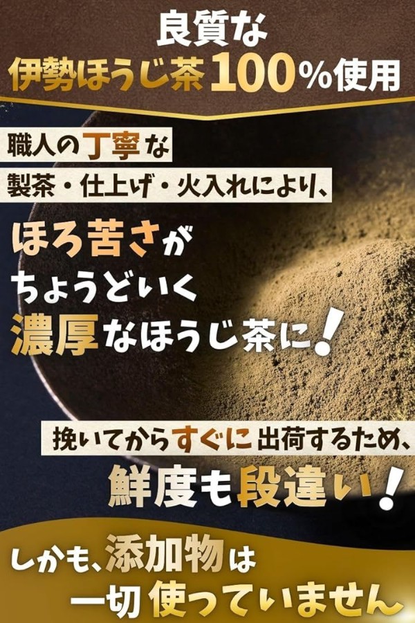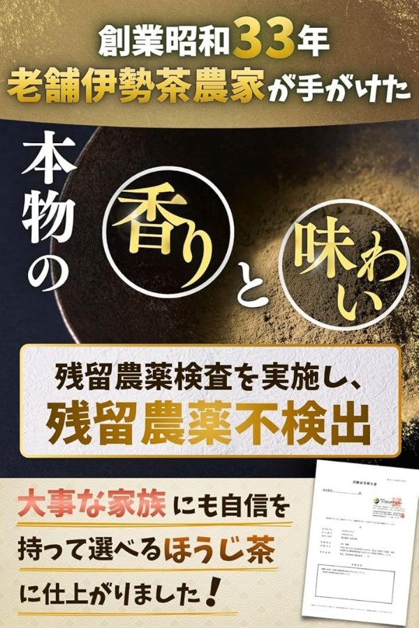 「創業昭和33年の老舗茶農家製造」創業から60年以上にわたる歴史を受け継ぐ茶農家が真心込めて作った、日本三代銘茶の1つとも呼ばれるブランド茶葉伊勢茶だけを使用している奇跡のほうじ茶です。