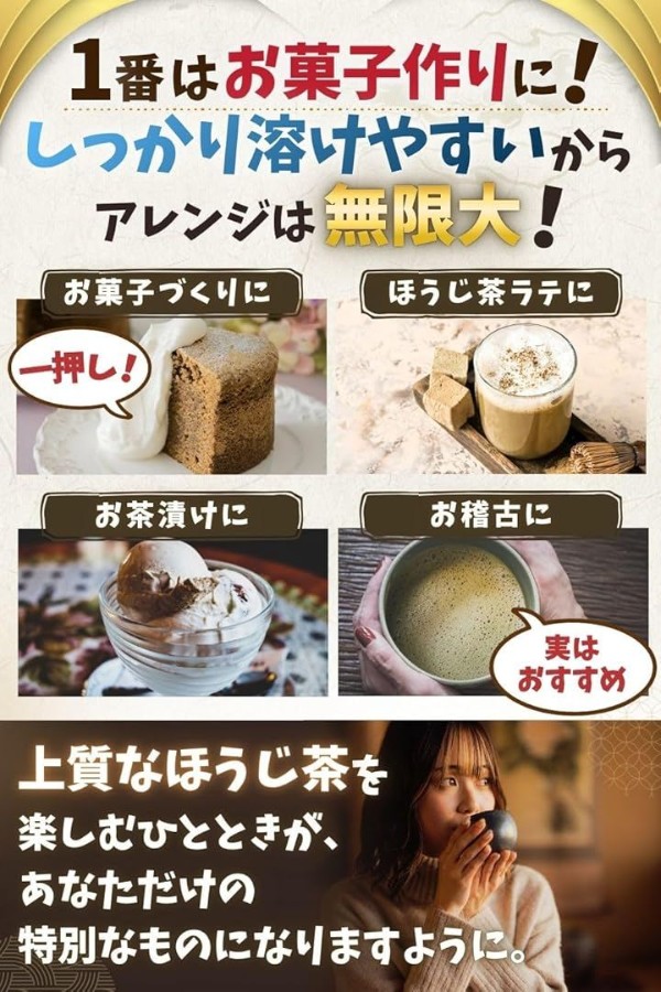 「ほうじ茶ラテやアイスにも最適」お湯に溶かしてティータイムを楽しんだり、お好みのアイスにかけて味わうのも生産農家イチオシの楽しみ方です。