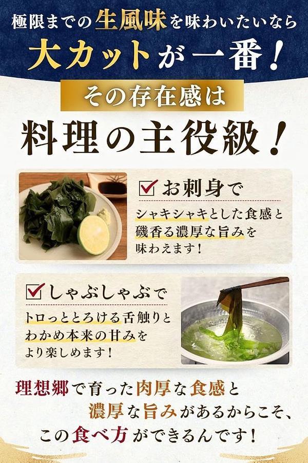 「料理の主役になる乾燥わかめ」大きめに切れば刺身やしゃぶしゃぶで”生風味”を、小さめに切ることで味噌汁や酢の物がワンランク上がる、どんな料理にも相性抜群なんです。