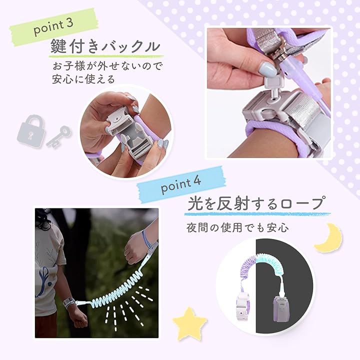 持ち運びもラクラク。 (6)光を反射するロープを使用しているので夜間の使用でも安心。 (7)万が一の際のホイッスル付き お子さまの迷子防止・飛び出し防止・安全対策にぴったりのアイテム。