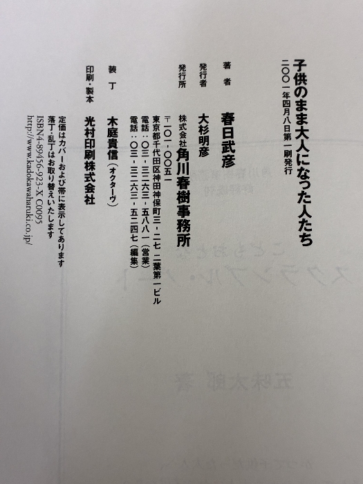 ■商品詳細■ 商品名・子供のまま大人になった人たち 角川春樹事務所 春日 武彦/ ■商品状態■表紙にスレ、ヤケ、多数のシミ、多少の傷み、天地小口にスレ、ヤケ、シミ、本にスレ、ヤケ、シミ、多少の折れ目、があります。本を読むことに支障はございません。※注意事項※■毎商品チェック後出品しておりますが、中古品ということもあり、多少の書き込み等のチェック漏れがあった際はご容赦下さい。■付録等の付属品がある商品の場合、記載されていない物は『付属なし』とご理解下さい。■併売販売をしているため、在庫切れの場合はキャンセルとなります。予めご了承ください。