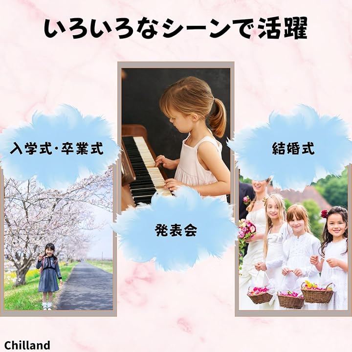 「あらゆるフォーマルシーンで活躍」入園式・入学式、卒園式、発表会、結婚式、七五三、写真撮影など、幅広いフォーマルシーンで使用できます。