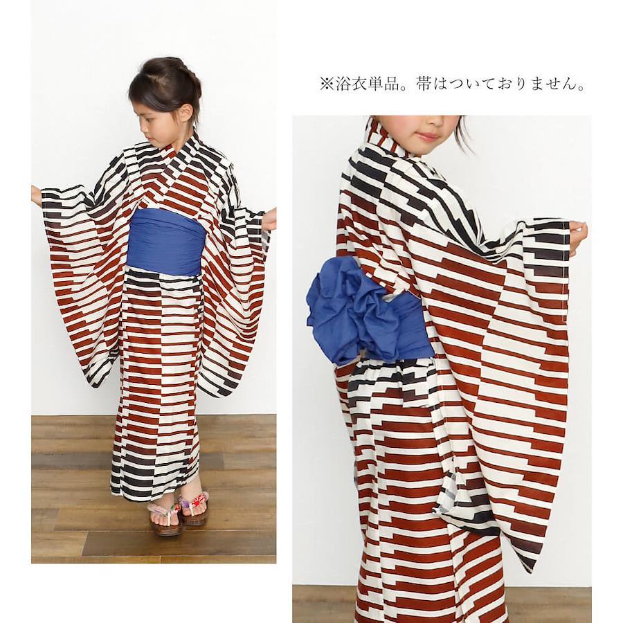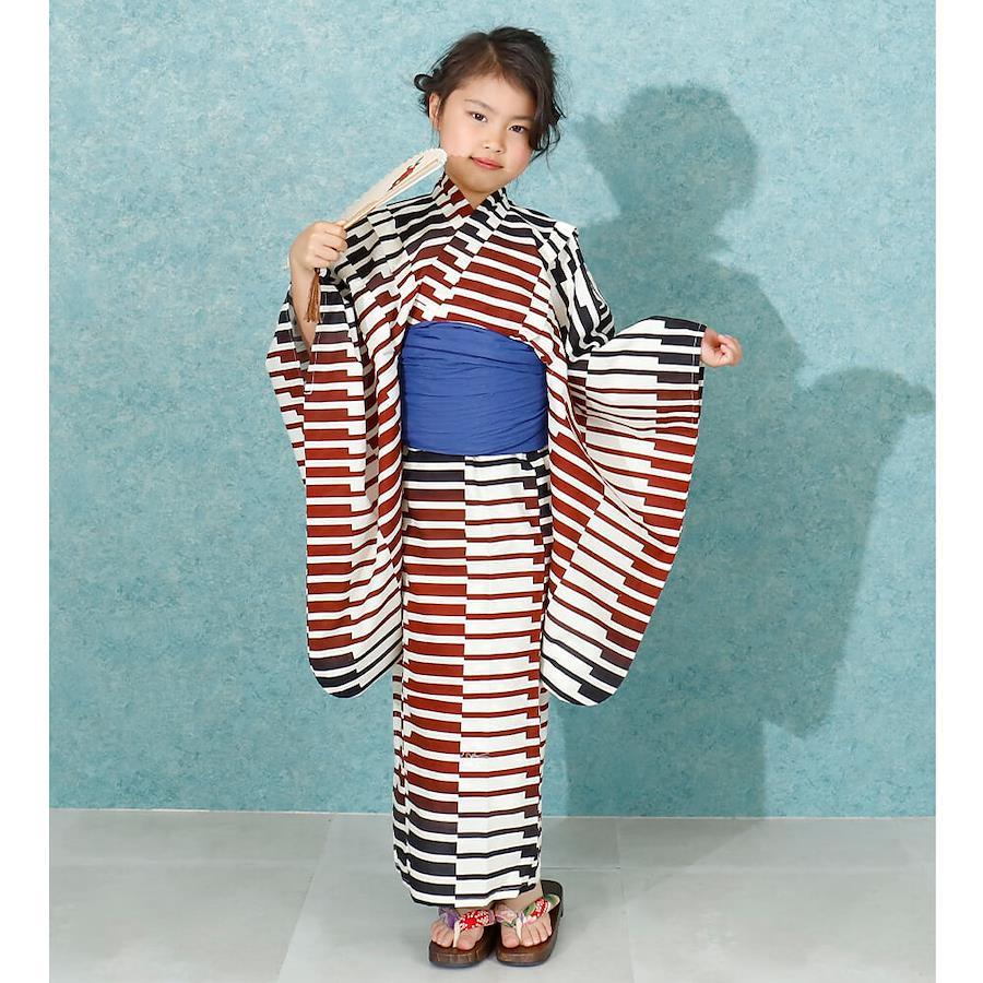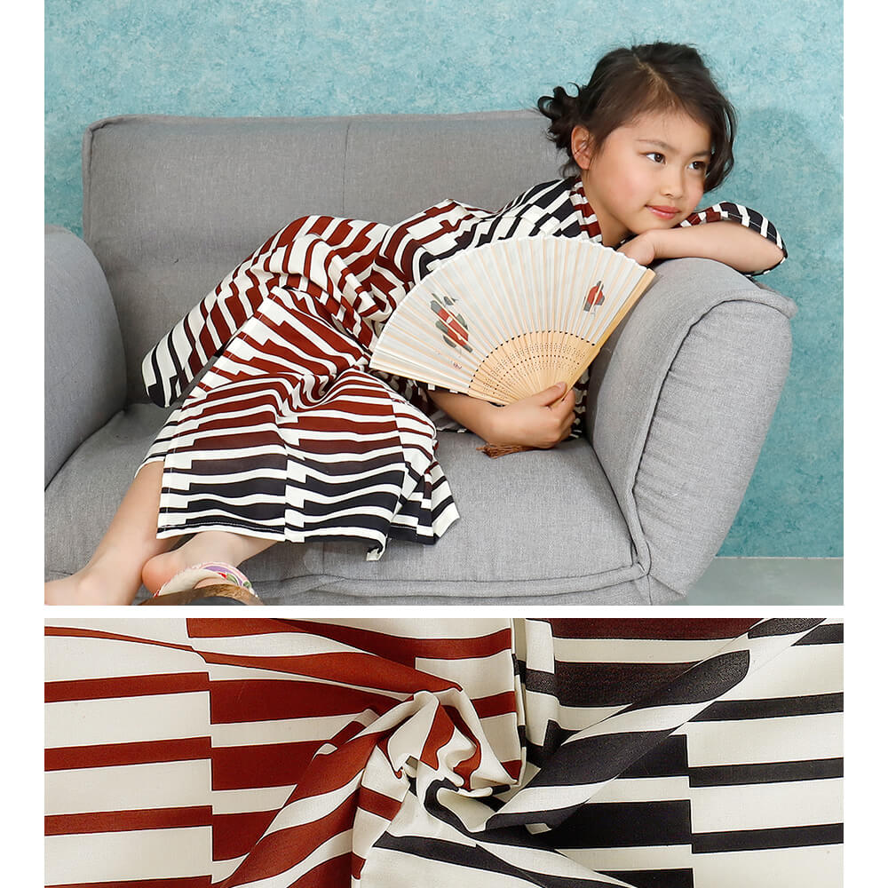 個性が光るストライプ柄が特徴の「レトロ縞」は、赤と黒のコントラストがスタイリッシュな印象のキッズ浴衣。大人顔負けのシックなデザインで、おしゃれに敏感な小学生におすすめです。お祭りや盆踊り、夏の特別な日をちょっと背伸びした気分で過ごせます。