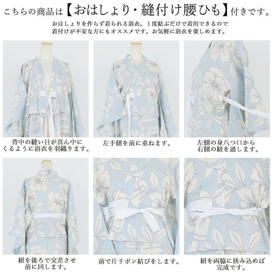 この浴衣は【縫付け腰ひも付き】なので、帯を巻くだけで簡単に着られます。「おはしょり」不要だから、着付けに不安がある方でも安心して楽しめます。120?130cmの身長に対応し、届いてすぐにお出かけできるのも魅力です。