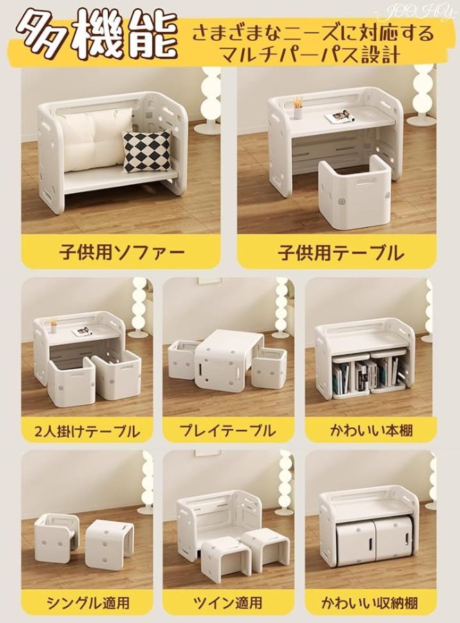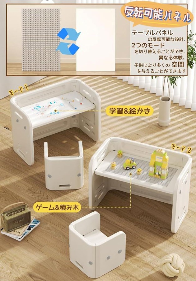 「変形可能」両面使用可能、お子様が小さいときは、スツールを背もたれモードとして使用でき、テーブルは物が落ちないように柵としても使えます。