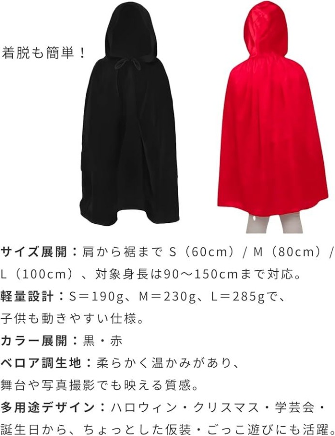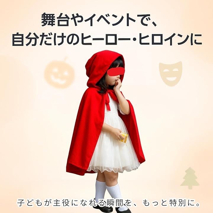 「たくさんの記憶を残しましょう。」 フード付きマントは、ハロウィンだけでなくクリスマス会や誕生日イベントなど、季節を超えて使えるコスチュームです。