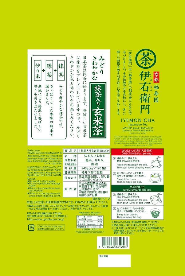 香ばしい玄米茶に抹茶をたっぷりとブレンドしたティーバッグです。みどりさわやかな色と味わいをお楽しみください。皆様で楽しんでいただける大容量タイプです。「伊右衛門」は「福寿園」の創業者にちなんで名づけました。その伝統の心を大切にし、常に新しい技術を加えた茶作りに専念しております。