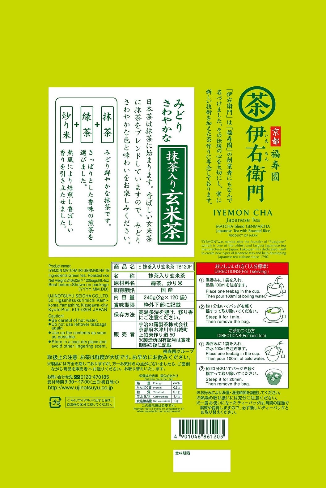 香ばしい玄米茶に抹茶をたっぷりとブレンドしたティーバッグです。みどりさわやかな色と味わいをお楽しみください。皆様で楽しんでいただける大容量タイプです。「伊右衛門」は「福寿園」の創業者にちなんで名づけました。その伝統の心を大切にし、常に新しい技術を加えた茶作りに専念しております。