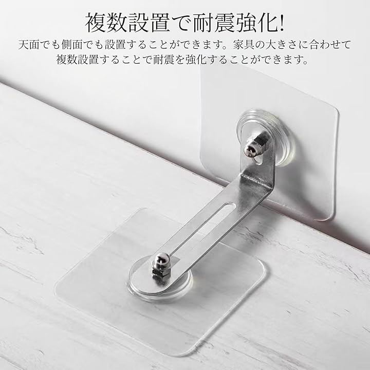 「耐震グッズ」でお困りのあなた こんな悩みありませんか? 壁に穴を開けたくない…部屋の美観を損ないたくない… お手頃で解決できる物が欲しい…耐震強度を強くしたい… その悩みをスッキリ解決。 クリアタイプで目立たない. 家具転倒防止金具。