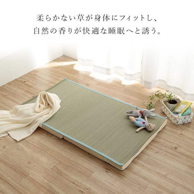 "国産(九州産)のい草を使用した敷きパッドです。一本一本が太く、表皮が厚く繊維がキメ細かいので弾力性があり、耐久性に優れています。また、無染土のい草を使用しておりますので柔らかく、すべすべとして身体にフィットします。赤ちゃんや子供はたくさん汗をかきます。い草シーツは汗を吸収してサラリと過ごせる快眠シーツです。通常、い草は草の青さを保ったり、日焼けをしにくくする為に「染土」といわれる泥でい草を染める作業を行います。その作業をしない無染土い草を使用した商品です。泥染め加工を行ったい草とは違い、素材そのままのい草ですから、粉っぽさもなく、ほこりがたちにくく、肌触りが良いので快適な睡眠をサポートします。四隅にゴムバンドが付いており、ずれにくくなっています。快眠い草の効能として1.綿の約2.5倍の吸湿力2.蒸れにくい。汗による湿気を吸うことにより温度を下げ快適な就寝を促します。3.汗のにおいを軽減。汗のにおいの元となる化学物質を90%以上抑えます。などがあります。暑苦しい日本の夏でも汗のジメジメを軽減してくれます。"