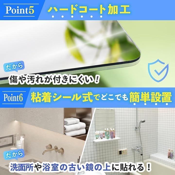 1.曇り止め加工、 2.粘着シール式、3.こだわりの映像、4.割れない、5.ハードコート加工(汚れ・傷防止)の特徴があります。