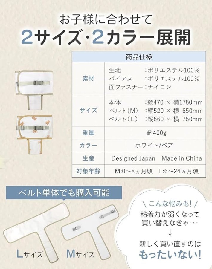 「2サイズ展開で長くご使用いただけます」お子様の成長に合わせてご使用いただけるよう、2サイズご用意いたしました。