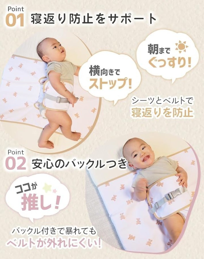 赤ちゃんの適切な睡眠環境の補助として使用することで、寝返りによる窒息や姿勢の崩れを防ぎ、夜間でも安心してぐっすり眠れる環境を整えます。