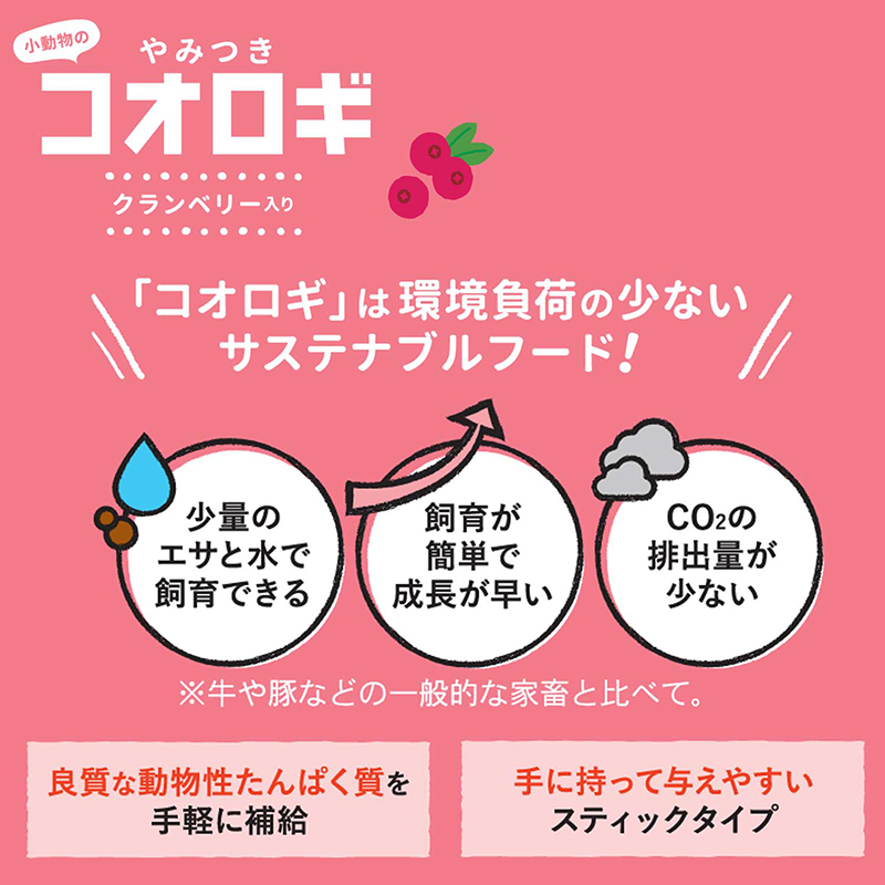 ・鶏ささみ生地にコオロギ粉末が入ったおやつです。・良質な動物性たん白質を手軽に摂取することができます。・ペットに動物性たん白質を摂らせてあげたいけど、昆虫が苦手な方に。・与えやすいスティックタイプ。・ハムスター・フェレット・ハリネズミ・モモンガなどの小動物に。・クランベリー入り。・早稲田大学発、昆虫食ベンチャー企業ecologgie社共同開発商品。【適応種】ハムスター、フェレット、ハリネズミ、モモンガなど