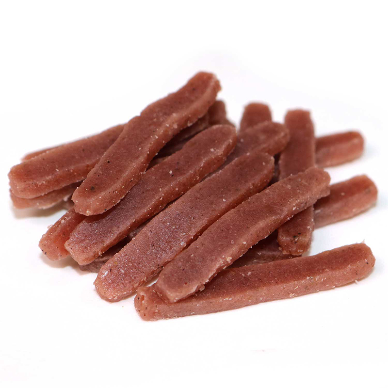 【原材料】肉類(鶏ササミ、鶏肉)、小麦粉、小麦たん白、糖類、コオロギ粉末、植物油脂、クランベリー果汁パウダー、グリセリン、トレハロース、ソルビトール、ミネラル類(ナトリウム)、着色料(クチナシ)、ポリリン酸ナトリウム、酸化防止剤(ビタミンE)【保証成分】粗たん白質18.0%以上、粗脂肪8.5%以上、粗繊維2.0%以下、粗灰分3.5%以下、水分32.0%以下【エネルギー】350kcal/100g