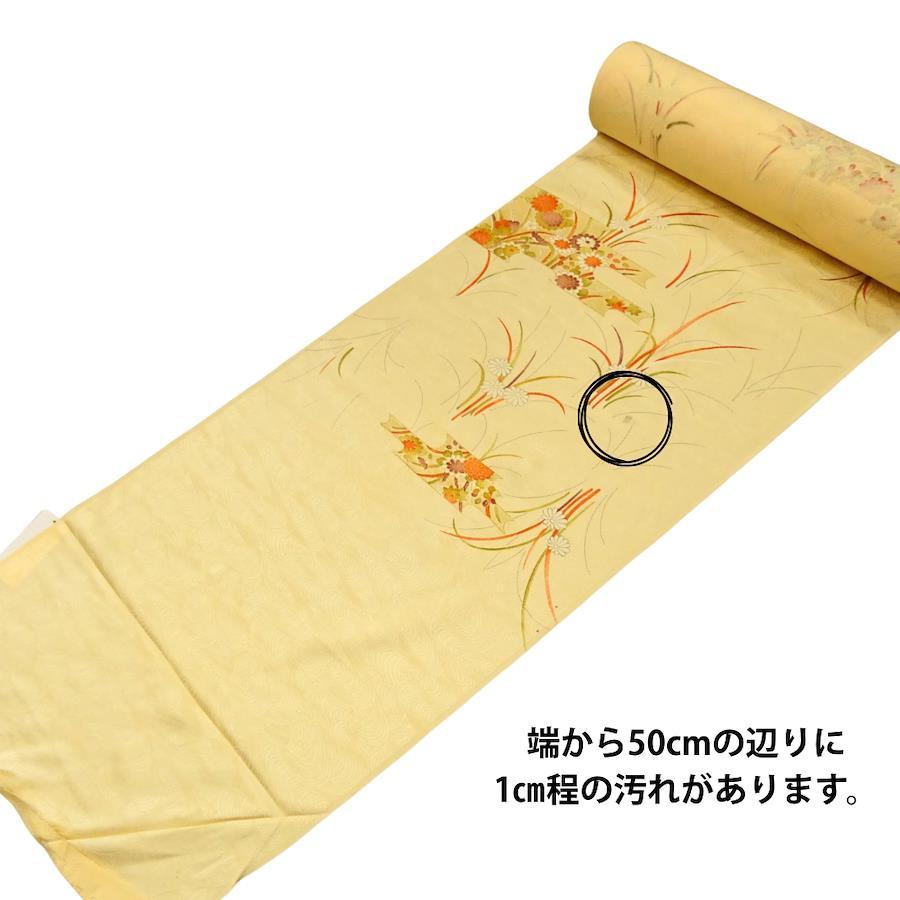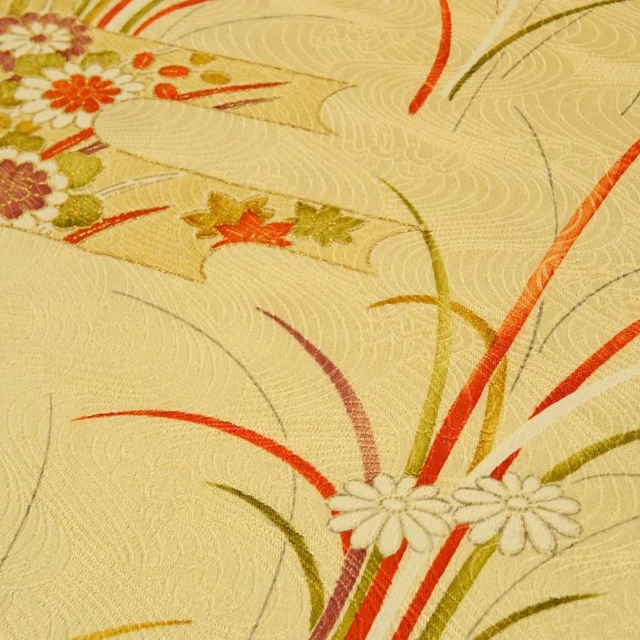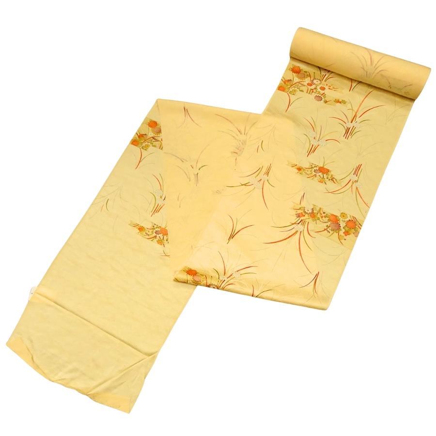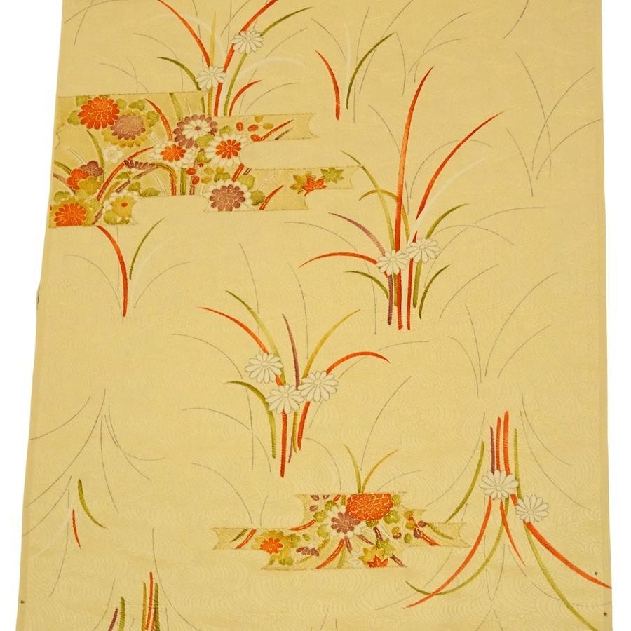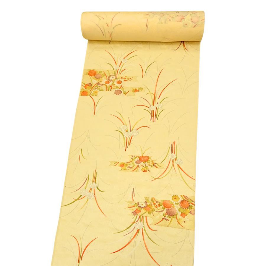 優しいイエロー系の地色に、色とりどりの花々が咲き誇る美しい小紋の反物です。菊、梅、紅葉などの古典的な花模様が、繊細な筆致で描かれており、上品かつ華やかな印象を与えます。