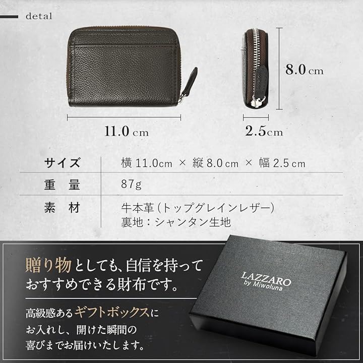 「5. サイズ・重量・ギフト対応」 サイズ:横11.0cm x 縦8.0cm x 厚み2.5cm 重量:約87g 素材:牛本革(トップグレインレザー)/裏地:シャンタン生地 高級感ある専用ギフトボックス入りで、贈り物としても最適。