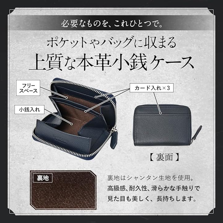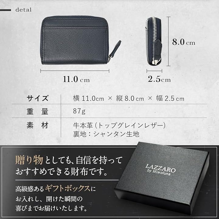 「5. サイズ・重量・ギフト対応」 サイズ:横11.0cm x 縦8.0cm x 厚み2.5cm 重量:約87g 素材:牛本革(トップグレインレザー)/裏地:シャンタン生地 高級感ある専用ギフトボックス入りで、贈り物としても最適。