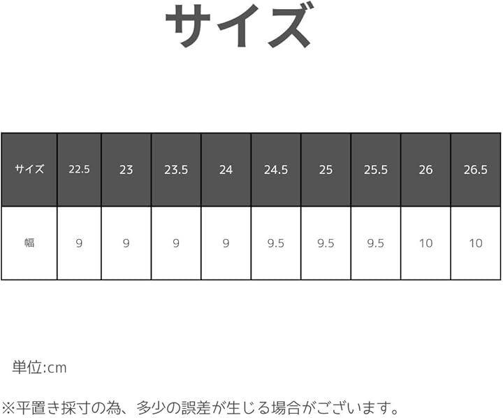 サイズ:22.5cm 全長:22.5cm 幅:9cm/23cm 全長:23cm 幅:9cm/23.5cm/24cm 全長:24cm 幅:9cm/24.5cm 全長:24.5cm 幅:9.5cm/25cm 全長:25cm 幅:9.5cm/25.5cm