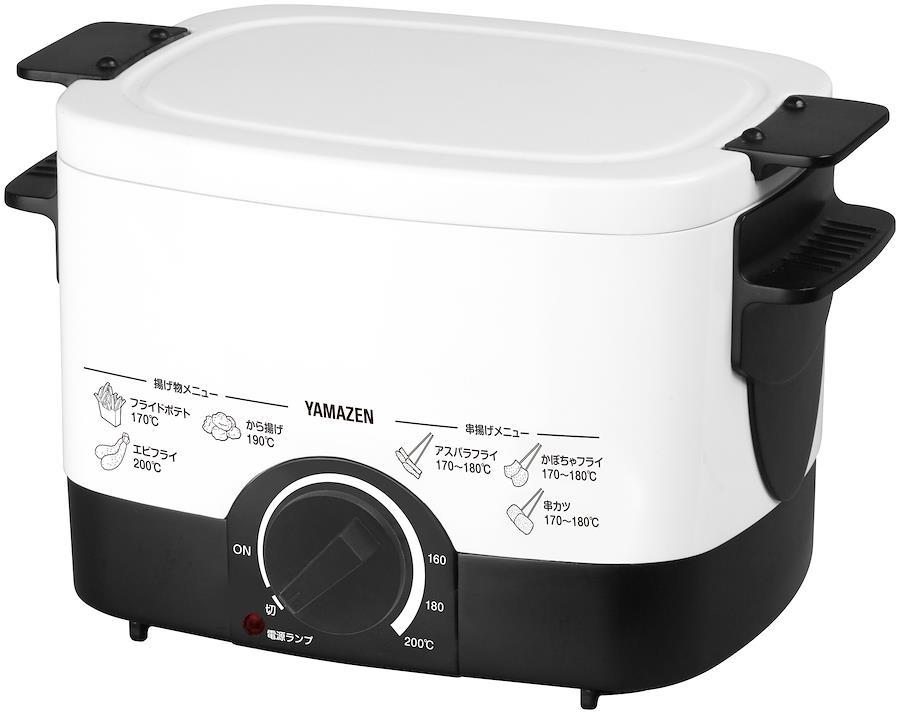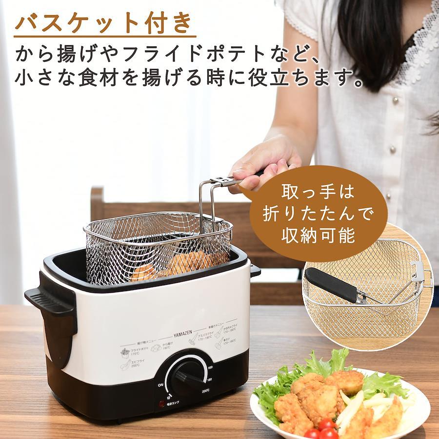 3営業日以内に発送≪新品未開封品≫:[山善] 電気フライヤー 揚げ物の達人 1.1L 卓上 家庭用 温度調節機能 (串ホルダー / 油切り用網 / 油受け兼用ふた付き) ホワイト YAC-M121(W)